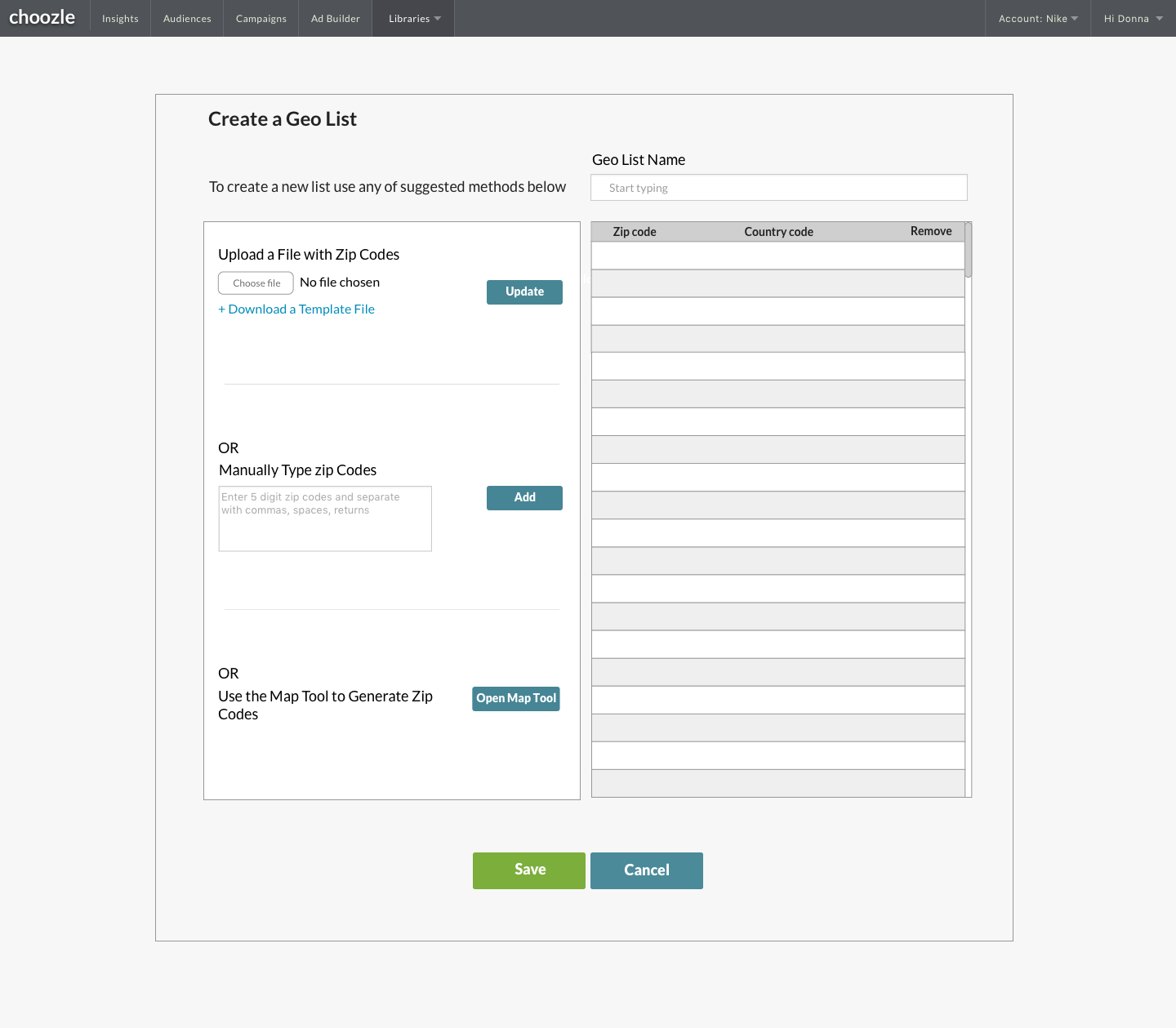 As a part of our larger goal to create a multi-platform ad-tech operating system, we needed to provide our users the ability to upload library assets, specifically geo lists, so they can be used in any buy-side platform. Currently, when a geo list is uploaded into the Choozle platform, the list is emailed to our support team who then uploads that list into TTD for TTD to process. After processing without errors, the list then becomes available in that account's Choozle Geo List Library and can be used in an ad group. Instead we want to store the geo list asset in Choozle and when selected for use within an ad group and send the data to the corresponding buy-side platform.